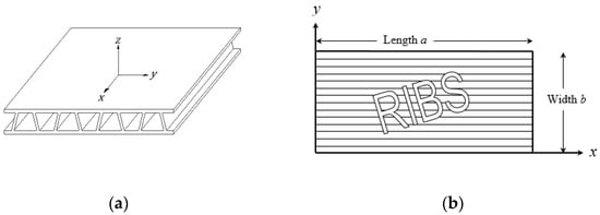 To calculate the multiwall plate response to distributed load, it is necessary to know the plate’s equivalent elastic properties, its dimensions (length–width), and the boundary conditions. Looking at the multiwall structure, it is obvious that the plate is orthotropic for both bending and tension, and its cross-section is transverse shear deformable. In the present study, it is assumed that all necessary equivalent elastic properties are already known. One should note that a procedure to obtain these equivalent properties of the plate is presented in Hakim and Abramovich [