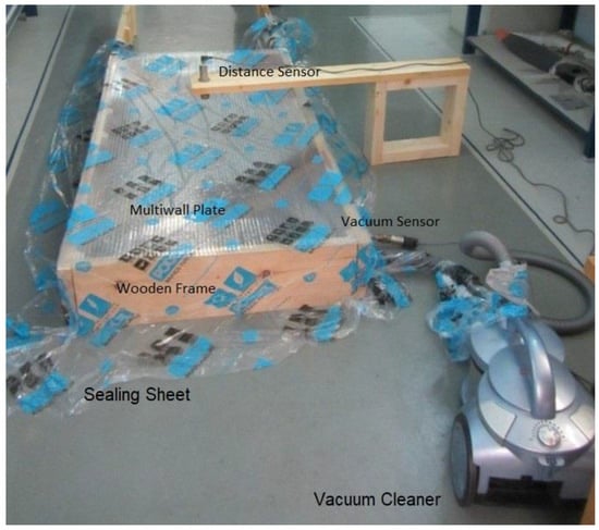 A 35 mm-thick wooden frame encloses a rectangular space with the required dimensions. The multiwall plate is freely placed on the frame’s edges. A thin plastic sheet covers the entire device and the floor near-by. A variable-speed vacuum cleaner is connected to the internal space through a drilled hole. The vacuum created causes the plastic sheet to seal all air leakages, allowing the vacuum level to gradually increase.