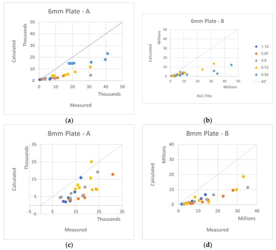 B measured coefficients, while the vertical axes are the theoretically calculated coefficients. The 45° lines represent the location of the perfect agreement between the theory and measurements. The various colors are for various plate widths [m], as shown in the