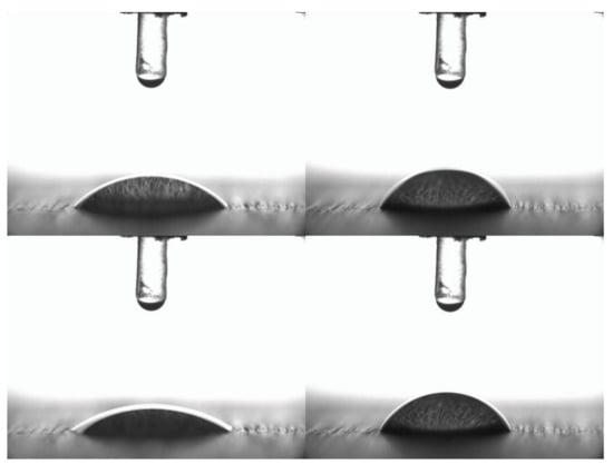 The Sessile Drop Technique was used with water (polar) and diiodomethane (DIM) (nonpolar) as test liquids. The surface energies of distilled water (polar and dispersive) and diiodomethane (dispersive) are 72.8 mN/m and 50.8 mN/m, respectively. The polar component of distilled water is 46.4 mN/m (63.74%), and the dispersive component is 26.4 mN/m (36.26%).