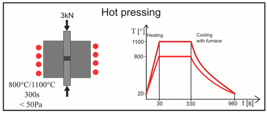 In the next step, the powder’s precursors were consolidated through a hot pressing process. The sintering step was carried out on Elbit (Koszyce Wielkie, Poland) equipment at 800 °C and 1100 °C, with an acting pressure of 3 kN in a vacuum condition (<50 Pa). Heating was conducted through induction; the heating time was 30 s and the holding time at the sintering temperature was 300 s. The scheme of the sintering process is shown in Figure 2. The specimens prepared by the above procedure were marked as Table 1 shows.