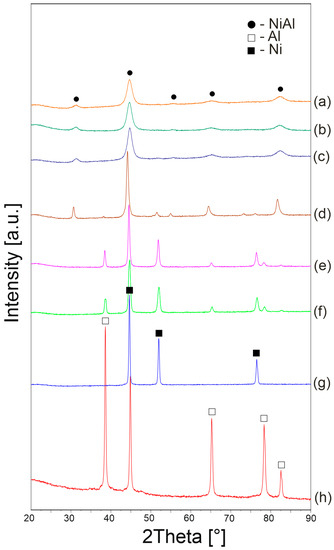 Nickel aluminide (NiAl) is an intermetallic phase with potential applications in high-temperature structural materials and coatings due to its attractive properties [1]. Over a wide range of Ni content (45.0 to 58.5 at. % Ni), NiAl crystallizes in the A2 lattice (bcc) and exhibits an ordered L2o (B2) crystal structure (2 atoms per cell—1 nickel atom from the corners, 1 aluminum atom from the geometric center of the cell). Moreover, the melting point reaches 1911 K [2,3]. This ordered structure provides high-temperature strength and thermal stability, while the presence of aluminum in the compound significantly improves its oxidation resistance [4]. In addition, NiAl has high thermal conductivity, relatively low density (5.90 g/cm3) and relatively good tribological properties [5]. However, properties that often preclude the use of pure NiAl phase are its low ductility and high brittleness at room temperature, as well as low creep resistance at high temperatures [4,6].
