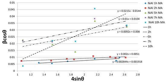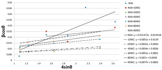 Figure 7. Linear Williamson–Hall plots with an obtained equation based on the XRD spectra of NiAl-xWC powder after 10 h of mechanical alloying.