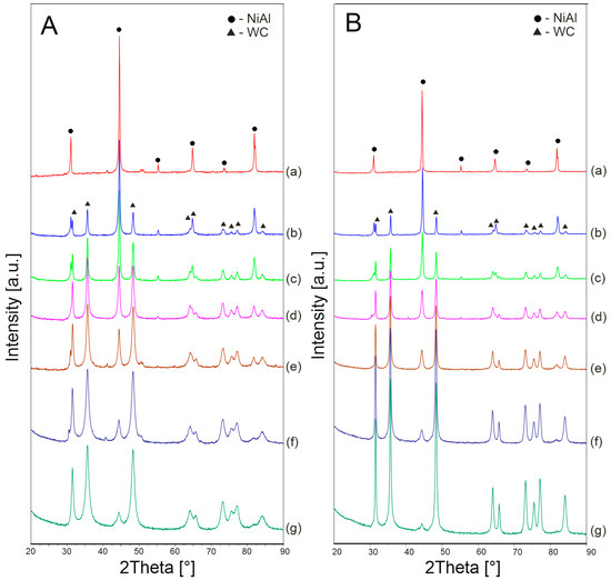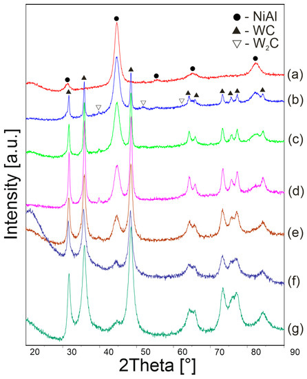 Figure 6 shows the XRD patterns of the powders after 10 h of mechanical alloying for various WC contents. After the process, the composite systems contain NiAl, WC phases and a small amount of W2C. However, the W2C phase occurs only in the powder composition. The phase recedes after the sintering process. The formation of the W2C phase after the mechanical alloying process means that during grinding the WC is depleted of carbon, which diffuses into the defective NiAl phase. During sintering, recrystallization of the phases and re-diffusion of carbon into the WC phase take place.