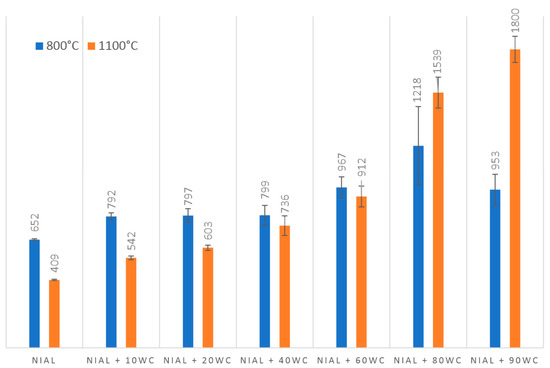 Figure 11. Vickers hardness of NiAl-xWC composites sintered at 800 °C and 1100 °C.