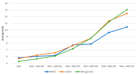 Figure 12. Calculated density and theoretical density of NiAl-xWC composites sintered at 800 °C and 1100 °C.