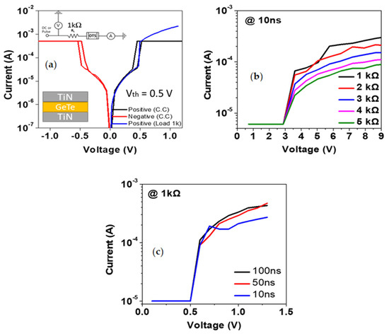 The OTS device exhibited identical values of Vth. Considering that typical OTS devices generally have different Vth values, our OTS device shows special features and, thus, should be investigated further [28,29]. In the results of the study, Valea, A. et al., it can be confirmed that the Vth is 1.4 V, which is different from the Vth (0.5 V) of our OTS device. In addition, the results of studies by Laguna, C. et al. also show that Vth is different from ours. Figure 2b shows the pulse-based current voltage (PIV) characteristics of the device with different external load resistors. Here, the pulse is ISPP (Incremental step pulse programming), and a method of measuring while continuously increasing the amplitude value in the same pulse width state is applied. During the PIV measurement, a series of pulses with different voltages was applied, and the resistance value of each step was measured using an oscilloscope. To prevent the device from breakdown during AC measurement, we set the external load resistance from 1 kΩ to 5 kΩ to check for breakdown voltage, which did not occur. As the external resistance approaches zero, more current flows through the element. Therefore, the pulse width was changed from 10 ns to 100 ns at a fixed external load of 1 kΩ to determine the minimum pulse width for proper operation of the device, as shown in Figure 2c.