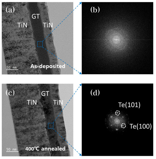 We performed an HR-TEM analysis for the direct observation of the GT thin film. Figure 5a shows a cross-sectional view of a TiN/GT/TiN structure before annealing the GT layer. Figure 5c shows a cross-sectional view of the same structure after 400 °C annealed. We analyzed the diffraction pattern in the blue dotted-ray rectangular region visible in the GT layer according to the fast Fourier transform (FFT) method. Figure 5b shows the diffraction pattern in the GT layer before annealing, and Figure 5d shows the pattern after 400 °C annealing. The FFT results of the GT layer before annealing showed amorphous characteristics, as illustrated in Figure 5b, and crystalline Te could be observed in the GT layer after annealing. This indicates that GT loses its amorphous properties at this temperature.