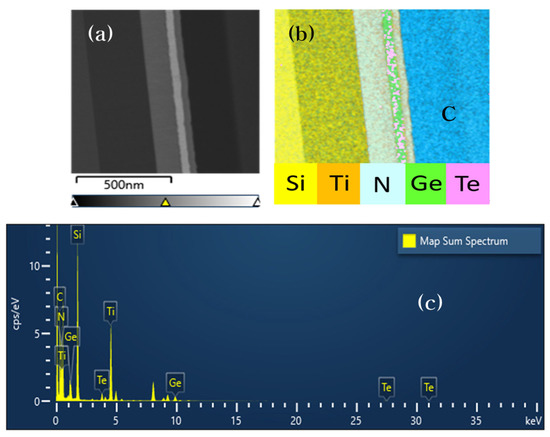 To investigate the composition of the device, we performed a transmission electron microscopy (TEM)/energy dispersive X-ray spectroscopy (EDS) analysis on the sample. Figure 6a shows a cross-sectional image of the TiN/GT/TiN device obtained by TEM analysis, and Figure 6b illustrates the results of the EDS analysis of the cross-section of the device. We can confirm that Te and Ge coexist between the bottom and top TiN layers. Figure 6c shows the map sum spectrum of the sample. The elements and atomic ratios of the TiN/GT/TiN device are shown in Table 1.
