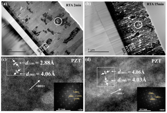 Additionally, Figure 4c,d are high-resolution TEM images taken from the RTA 2 min and RTA 15 min films, respectively. The inset images are selected area electron diffraction (SAED) patterns taken from the areas encircled by the dashed rectangles via Fast Fourier Transformation (FFT). It is noted that the two TEM samples shown in Figure 4 had different zone axes, <1 −1 0> for the RTA 2 min film and <0 1 0> for the RTA 15 min film. The lattice parameters of the out-of-plane [001] and in-plane [110] directions of the RTA 2 min film were measured to be 4.06 Å and 2.88 Å, respectively, which are close to the bulk values of the PZT 53/47 ceramic (4.03 Å for [001], 2.89 Å for [110]). Similarly, the lattice parameters of the out-of-plane [001] and in-plane [100] directions of the PZT RTA 15 min film matched closely with the bulk values. These data showed that the two films were both close to a relaxed state and had similar lattice parameters. Such an observation is consistent with the XRD patterns shown in Figure 2, i.e., an extended annealing did not vary the average lattice parameters of the PZT films.
