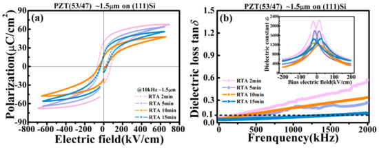 The room-temperature ferroelectric hysteresis loops (P-E loops) of the PZT films are shown in Figure 5a. The RTA 2 min film displays the highest remnant and saturated polarizations (Pr~39.0 μC/cm2, Ps~67.6 μC/cm2) and the largest coercive field (Ec~73 kV/cm), when compared with those annealed for a longer time. Furthermore, in the dielectric constant-bias electric field (εr-E) curves shown in the inset of Figure 5b, the RTA 2 min film also shows the largest small field dielectric constant εr (~1865 @ zero bias field). However, from the dispersion curves of the dielectric loss tangents (tgδ-f), the RTA 2 min film showed the highest dielectric loss in the full range of the measuring frequency (1 kHz–2 MHz, especially in the high end). On the other hand, the RTA 15 min film showed the opposite trends in its electrical performance, i.e., the lowest polarization values and Ec, as well as the smallest εr and tgδ. These property data agreed well with our proposed model of the two competing effects on the electrical performance, i.e., reduction in residual PbO (hence a decreased dielectric loss) and proliferation of nanopores (hence lowered electrical polarizations, coercive field and dielectric constant) with an increasing annealing time. The electrical performances of the two films with intermediate annealing times are between those of the RTA 2 min and 15 min ones. The RTA 10 min film, of special note, showed the worst overall performance among the four films, which includes the smallest Pr, Ps and εr, and a loss tangent only slightly better than that of the RTA 2 min film. These performance data are well correlated with the microstructure characteristics shown in Figure 3, i.e., a porous coarse grain structure with concentrated nanopores near the film’s bottom interface [29,30]. Such a microstructure is at the transition point of the film’s morphology evolution, based on our analysis of the SEM images.