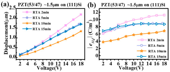 Figure 6a,b display the tip displacements (δ) and the computed converse transverse piezoelectric coefficients (e31,f) of the PZT film cantilever beams as functions of an applied external AC voltage (sine wave, 500 Hz) [26,32]. There was no pre-poling step used, and the applied voltage increased monotonically from 2 V to 18 V. It can be seen that all films except the RTA 10 min one showed similar piezoelectric displacement and e31,f values at a low AC voltage (V ≤ 6 V). This can be explained by a low poling field (~40 kV/cm) which does not fully activate the ferroelectric domains in the films, especially the RTA 2 min film, which has the largest coercive field Ec ~73 kV/cm. However, as the voltage was increased to 8 volts and higher, the RTA 2 min film showed an accelerated increase in the piezoelectric displacement, corresponding to an increasing e31,f. It was not until the voltage reached 18 volts (~ 120 kV/cm), close to twice as large as the coercive voltage of the RTA 2 min film, that its e31,f piezoelectric coefficient kept on increasing and left those of the RTA 5 min and RTA 15 min films well behind. The highest e31,f value achieved was that of the RTA 2 min film at 18 volts, which is about −11.2 C/m2 and close to those reported for (001) PZT film grown on the commonly used (100) Si substrate [26,27]. This high piezoelectric performance of the RTA 2 min film is consistent with its (001)-preferred crystalline orientation (Figure 1) with a dense columnar grain structure (very few pores, Figure 3 and Figure 4), as well as its outstanding ferroelectric and dielectric properties (Figure 5). On the other hand, the two films with an extended RTA time, i.e., RTA 5 min and RTA 15 min, showed similar piezoelectric performances with a saturated e31,f coefficient ~−8.5 C/m2 at V ≥ 8 volts. These characteristics are consistent with the proliferation of nanopores in these films, which caused reduced ferroelectric and dielectric performances (Figure 5), as well as a reduced coercive field and hence a lower poling voltage. Lastly, due to a transitioning grain morphology with a “damaged” interface [14,15], the piezoelectric performance of the RTA 10 min film was the poorest among the PZT films, which started at ~−4 C/m2 and saturated at ~−6 C/m2. It is noted that the e31,f values obtained by the current method are apparent/average converse e31,f piezoelectric coefficients at a given AC electric field/voltage, [33]. The nonlinear piezoelectric responses of a ferroelectric, including a Rayleigh law-type behavior for the small field piezoelectric coefficient, are often the results of extrinsic contributions including the domain wall contribution to the piezoelectric property [34]. In our case of a ferroelectric film, its nonlinear piezoelectric response can be properly investigated by combining an experimental approach that we recently developed [33,35] with the analytical method reported in Ref. [34]. Such an investigation will require superimposing a small signal AC field on a sweeping dc bias field to test the instantaneous piezoelectric coefficient as a function of the dc bias, and a collection of abundant data points under sub-coercive bias fields. The outcome of this investigation will help us achieve a deeper understanding of the structure–property relationship in these PZT films, for example, how the domain wall mobility and density of domain walls vary as a function of the annealing time. Therefore, we plan to carry out a dedicated study in the near future on the piezoelectric responses of these PZT films.