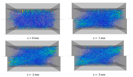 The vectors are sketched for 1 of the samples sheared under to a displacement of . The sample shows the displacement of the particles: in the lower box, there are large movements of particles to the right, and in the upper box, there are only slight convex thrusts. Due to the simulations’ choice to move the bottom box to the right, there is a variation in the magnitude of displacement between the lower and upper boxes.