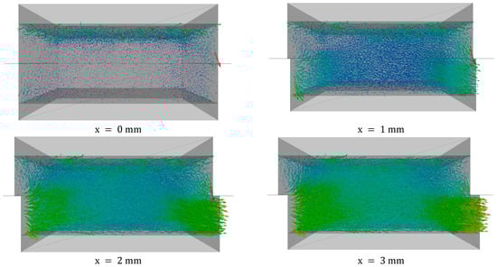 Figure 7 shows the evolution of the displacement vectors of the particles within the granular specimen. Particle displacement vectors are provided as illustrated by two independent properties: the force direction and magnitude. Each vector represents the particle’s displacement, with the beginning and end of the vector corresponding to the particle’s initial and final positions and the length of the distance traveled.