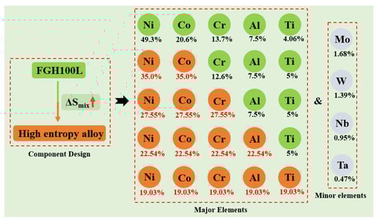 Since HEAs are composed of at least five elements, it is difficult to predict the composition and structure of alloys via phase diagram calculations and first principles. Therefore, new research methods need to be developed [15]. Zhang et al. proposed the widely-recognized HEA solid-solution theory based on the rules of alloy phase formation [16,17]. According to the rules of phase formation, an HEA solid solution can be formed as long as the parameters are within a theoretical range when designing the HEA composition. The main parameters ranges are atomic radius difference (0 ≤ δ ≤ 6.6), mixing enthalpy (−15 ≤ ∆Hmix ≤ 5 kJ mol−1), mixing entropy (11 ≤ ∆Smix ≤ 19.5 kJ mol−1), and thermodynamic constant (Ω > 1.1). In this study, based on FGH100L and the HEA design concept, the HEA composition was prepared with Ni, Co, Cr, Al, and Ti as the main elements, and Mo, W, Nb, and Ta as secondary elements. The main components of the alloy were gradually adjusted according to the principle of entropy increase, as shown in Figure 1. Four kinds of HEA were designed (Ⅰ–Ⅳ):