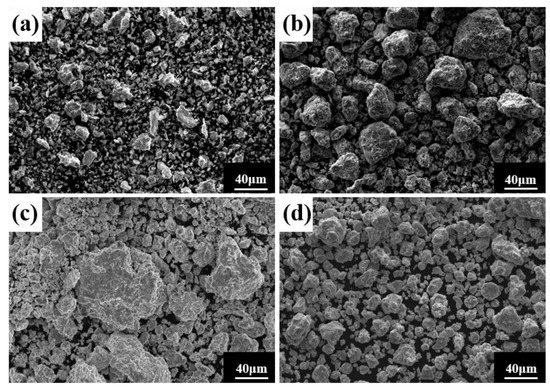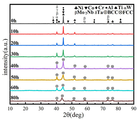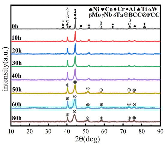 Ball milling time is a key parameter affecting powder phase structure and microstructure. Figure 2 gives the XRD pattern of the powder when the milling time is the only variable (up to 80 h), the milling speed is 300 r min−1, and the PCA is ethanol. The diffraction peak broadened as milling time increased, showing that the powder particle size steadily reduced, an effect attributed to crystallite refinement, decreased crystallinity, and aggregated lattice strain [27,28,29]. In the early stage of ball milling, diffraction peaks corresponding to each metal element are evident. After 50 h milling, the powder is completely alloyed and the dual phase BCC+FCC structure is formed; the FCC phase is the main phase. Until 80 h, the phase structure does not change, but the diffraction peak widens. Figure 3 gives SEM photographs of the powder at different milling time. The powder becomes a non-uniform block after milling for 10 h, mainly because, at the early stage of milling, initial spheroidal powders constantly collided with and are squeezed by balls of different sizes. After milling for 40 h, the phenomenon of powder agglomeration begins due to a cycling process of fracture into fine particles and the cold welding of the broken powder. After 60 h and 80 h, the powder agglomerates and stacks together to form a solid solution showing complete alloying, as indicated by the XRD pattern of Figure 2.