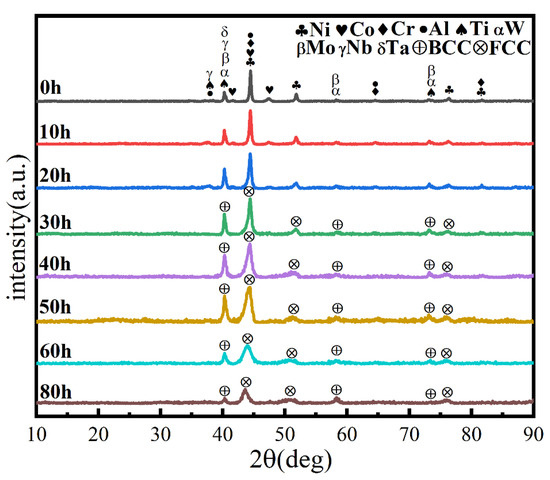 Similarly, the milling speed is another key MA parameter affecting the temperature in the spherical tank, the degree of powder refinement, and the degree of powder alloying. It is generally believed that the higher the ball milling speed, the greater the energy applied to the powder, facilitating alloying. Figure 4 shows the powder phase structure at different times when the milling speed is increased to 500 r min−1, the total time is 80 h, and the PCA is ethanol. After 30 h, the powder has been alloyed completely. The position of the diffraction peak has not changed, and a dual-phase BCC+FCC structure is formed (FCC is the main phase), indicating that increasing milling speed does not affect the alloying process. As shown in Figure 5, the powder particle size is smaller, and the agglomeration is closer, since increasing milling speed intensifies collision between the powder and the balls, and intensifies the cycling process of cold welding and crushing.
