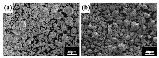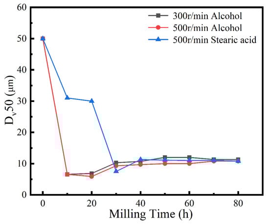 A process control agent (PCA), which can be a solid, liquid or gas, is essential in MA to prevent excessive cold welding during ball milling, to prevent the powder from adhering to the milling balls and the inner wall of the milling tank, and to homogenize and improve the yield of the powder. Different PCAs can produce different results [30]. Generally, the loading of PCA is 1–5 wt% of the total powder. Excessive PCA not only pollutes the powder but also affects atomic diffusion and inhibits alloying [31]. Common PCAs include stearic acid, ethane, methanol, and ethanol. Figure 6 shows the phase structure with different milling times and stearic acid as the PCA. With the extension of milling time, the diffraction pattern does not change after 20 h, while the diffraction peak disappears after 30 h, and the powder is completely alloyed after 40 h, forming a dual-phase structure of BCC+FCC, in which FCC is the main phase. Compared with ethanol as PCA, the powder alloying time is extended from 30 to 40 h, indicating that when stearic acid is the PCA, the alloying process is inhibited to some extent, requiring a longer milling time. Figure 7 shows the SEM images of the powders when ethanol and stearic acid were used as PCA at a milling speed of 500 r min−1 for 30 h. As shown in Figure 7b, the powders were mostly long flakes with poor agglomeration since, in the early stage of ball milling, the powder is easily broken into fine and irregular particles under the collision and extrusion of the balls. The specific surface area and surface energy of the powder increase as the powder particle size decreases, resulting in an unstable energy state, and the consequent aggregation of the crushed powder particles to reduce the powder surface energy and form a more stable state [32]. However, when stearic acid is used as PCA, it adheres to the surface of the powder during the early stage of ball milling, inhibiting the aggregation of the powder particles, resulting in a crushed powder mainly comprised of tiny sheets. At the same time, because a layer of stearic acid envelops the powder, the powder alloying process will be slowed down. Until the stearic acid disperses after prolonged ball milling, the powder alloying process will not proceed. Figure 8 shows the curve of milling time and Dv50 under different milling parameters. When ethanol was PCA, the powder particle size decreased significantly after 10 h of ball milling, indicating that the powder was broken into fine particles under the impact and extrusion of the milling balls. However, when stearic acid was used as PCA, the powder particle size decreased less, further indicating that stearic acid adheres to the powder surface preventing its agglomeration and causing the powder to exist in the form of flakes. On stearic acid dispersion after 30 h, the powder particle size decreased significantly. On the whole, the powder particle size at 500 r min−1 is smaller than at 300 r min−1, indicating that the powder can be refined by increasing the ball milling speed.
