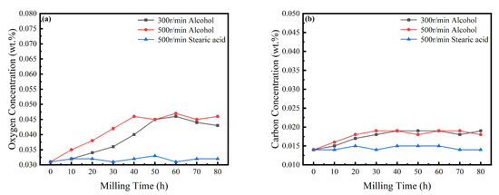 In the MA process, it is necessary to strictly control the content of elemental O and C in the powder [33]. Figure 9 shows the content of O and C in the powder with time, revealing a slight increase with an increasing milling time, mainly due to the decomposition of the ethanol PCA. When stearic acid is used as PCA, the content of O and C is basically maintained in an equilibrium state and, although there are changes, the content of both is always less than 0.05 wt%. Experiments were carried out in an anaerobic argon environment, but it is very challenging to completely avoid contamination during mechanical alloying. As an inherent feature of the powder metallurgy process [34], possible contamination sources can only be controlled and mitigated.