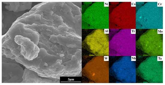 To optimize experimental efficiency in the subsequent SPS step, the powder ball milling parameters selected were a milling time of 60 h, milling speed of 300 r min−1, and ethanol as PCA. To ensure the complete alloying of the powder, agglomerates in the powder after milling were analyzed using EDS. As shown in Figure 10, the elements are evenly distributed. Combined with the XRD results of Figure 2, the complete alloying of the powder is revealed under the selected milling parameters.