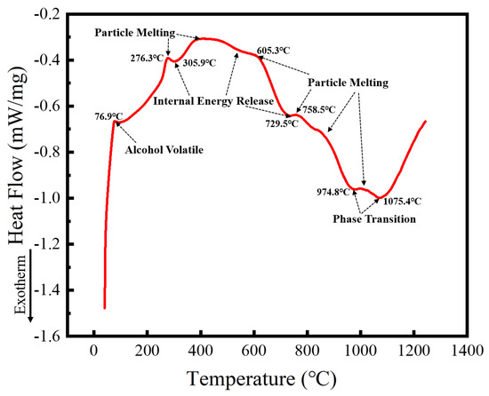 Spark plasma sintering (SPS) is a process that integrates heating and pressure, compressing the powder into dense blocks in a short time, and requiring a large quantity of powder. The alloy powder prepared with a milling speed of 300 r min−1 for 60 h and ethanol PCA was selected as the SPS raw material to prepare the HEA blocks. Microstructure, phase structure, and the properties of the HEA blocks sintered at different temperatures were studied. To determine the temperature range required for SPS, the alloyed powder was analyzed using DSC, with the results shown in Figure 11. The heat flux with temperature follows a trend of rising, falling, and rising again. The upward trend is endothermic, while the downward one is exothermic. Because the milling PCA was ethanol, which is volatile with a boiling point of 78 °C, the first endothermic peak at 76.9 °C corresponds to ethanol volatilization. With the increasing temperature, a second endothermic peak occurs at 276.3 °C. Given that the crushing and rolling of the milling ball forms powders with particle sizes of several hundred nanometers, the endothermic peak is caused by nanoparticle melting. At the same time, because lattice distortion of the powder occurs from prolonged milling ball collisions, the strain energy held in the powder can be released on heating. As a result, the first exothermic peak arises at 305.9 °C, and heat absorption and release happen simultaneously, resulting in a reasonably flat transition between 400 and 600 °C. Similarly, heat absorption induced by particle melting and heat release caused by internal energy release occur at around 700–900 °C. MA is a non-equilibrium process. The powder after ball milling will be in a metastable state, and a higher temperature will cause the powder to undergo exsolution and phase change. Therefore, phase transformation is likely to occur at 974.8 °C and 1075.4 °C. Five SPS sintering temperatures of 950, 1000, 1050, 1100, and 1150 °C were selected based on the DSC curve data, and the microstructure and phase structure of the block sintered at these temperatures were studied.