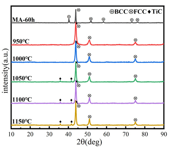 XRD analysis of the microstructure and phase structure of the alloys after SPS is given in Figure 12. The phase structure changed at 950 °C, consistent with the prediction based on the DSC curve. The powder changed from a dual-phase to a single FCC phase structure, possibly due to a solid-solution transformation of BCC to FCC phase. With the increasing sintering temperature, a small amount of interstitial solid solution TiC is generated, possibly due to the interaction between the HEA powder and carbon in the SPS graphite mold, resulting in surface carburizing. Carbon atoms enter the lattice of HEA, forming carbides and causing lattice distortion, one of the four major characteristics of HEAs. As a basic structural parameter of crystal materials, the lattice parameter is typically used to determine the degree of lattice distortion [35]. According to Bragg’s law and the interplanar spacing of the cubic crystal system, the formula for calculating lattice parameters is as follows: