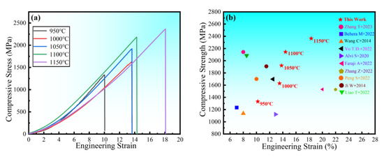 Engineering stress–strain curve of the block under compression (a) at room temperature and (b) strength compared with other HEAs [27,38,39,40,41,42,43,44,45,46].