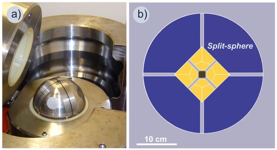 The HPHT experiments were carried out using a multiple-anvil high-pressure apparatus of the “split-sphere” type developed at the Institute of geology and mineralogy, Siberian Branch of the Russian Academy of Sciences (Novosibirsk, Russia) with accordance to the state assignment. Such types of machines are well-known in the literature [58,59,60]. The apparatus does not have a press, and its body consists of two opening semi-blocks, which are enfolded by two flange-type semi-cases (Figure 1a). When closed, a spherical chamber is formed within the semi-blocks which is the space for a multi-anvil spherical guideblock. Two elastic membranes installed inside the semi-blocks separate the guideblock from the apparatus body. Both semi-blocks have channels for pumping oil under the membranes. The loading pressure is transmitted through the membranes to the guideblock. The multi-anvil spherical guideblock named “8/6” consists of the first outer (8) and second inner (6) stages (Figure 1b). The outer stage is a sphere with a diameter of 300 mm consisting of eight separate segments—steel anvils. The top of each anvil is truncated in the form of an equilateral triangle. Compressible plastic gaskets are installed between all anvils of the stage. As assembled, the split-sphere has an octahedral-shaped chamber in its center designed to install six tungsten carbide (WC) anvils. Their truncated tops, in turn, form a parallelepiped-shaped chamber within that is the space for a high-pressure cell (HPC). Pressure in the cell increases as a result of the multiplication of load applied to the spherical outer block and is proportional to the surface ratio between the outer block and the truncated tops of the WC anvils.