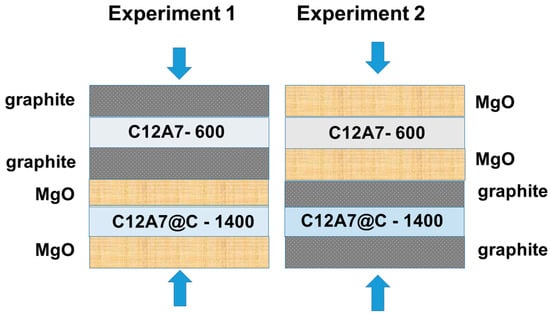 MgO (analytically pure, Krasnyi Khimik, Saint Petersburg, Russia) and graphite (Rizhao Hengqiao Carbon Co., Ltd., Rizhao, China) were chosen as materials for the buffer layers since they are inert enough with regard to mayenite at atmospheric pressure and their contact is not accompanied by the destruction of the mayenite structure up to the temperatures of 1500–1600 °C [27,46]. The disposition of the layers in the experiments is shown in Figure 2. In the first experiment, the C12A7-600 sample was placed between the graphite layers, while the C12A7@C-1400 sample was located between the MgO layers. In the second experiment, the arrangement of the samples and the buffer layers was opposite: C12A7-600 between the MgO layers and C12A7@C-1400 between the graphite layers. The thickness of the graphite layers in both experiments was 1 mm (90 mg). The MgO layers were 2 mm in thickness which corresponds to a weight of 280 mg. The weight of the studied mayenite samples in each layer was 40 mg. The HPHT experiments were performed at a pressure of 4 GPa and a temperature of 1450 °C. The duration of each experiment was 1 h.