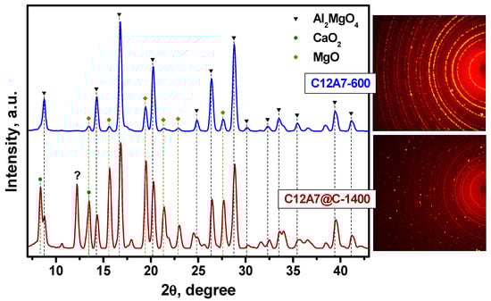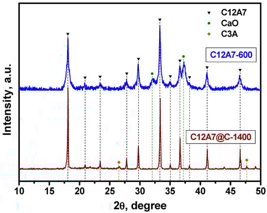 First, the two as-prepared samples, C12A7-600 and C12A7@C-1400, were characterized by X-ray diffraction analysis. As follows from Figure 3, the patterns for these samples are noticeably different in the width of the diffraction reflections. This is due to differences in the size of mayenite nanoparticles in such samples and is well consistent with the previously reported data [45,57]. The C12A7-600 sample contains traces of unreacted CaO at this temperature (ICDD card #37-1497), which are absent in the C12A7@C-1400 sample treated at a higher temperature. The impurity C3A phase (ICDD #38-1429) was found in the latter. Refinement of the unit cubic cell parameter showed that in the case of the C12A7-600 sample calcined in an oxygen-containing medium (air), the lattice parameter a (12.023 Å) is slightly higher than for the C12A7@C-1400 sample (12.007 Å). The increased value of the lattice parameter at 600 °C can be associated with a high proportion of the C12A7:OH− states in the structure. Similar behavior of parameter a after treatment of mayenite samples in an oxygen-containing atmosphere and in a vacuum was already observed and discussed in the literature [57,67,68]. The reasons for such differences are stipulated by the presence of oxygen-containing anions (X− = OH−, O2−, O−, and O2−) in the anion sublattice of the C12A7-600 sample and their absence in the case of the electride-state sample C12A7@C-1400 (X− = e−), parameter a for which takes a value close to that observed for the electride C12A7:e− [57,69,70].