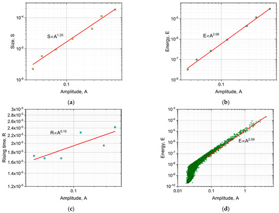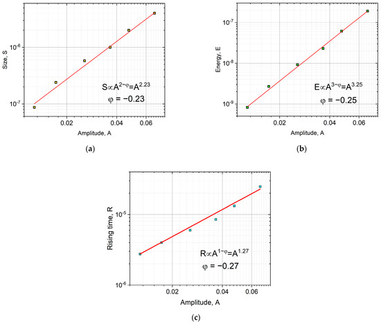 Scaling functions between the (a): averaged avalanche area, , and amplitude, , (b): averaged energy, , and amplitude; as well as (c): averaged rising time, , and amplitude. The values from the fittings of (a–c) are −0.23 ± 0.03, −0.25 ± 0.02, and −0.27 ± 0.02, respectively.