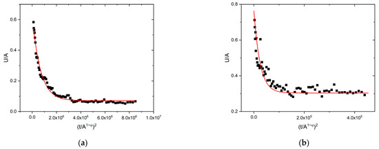 We can also check whether the exponent 2 in relation (2) gives a good description of the experimental data or not (see, e.g., the trials in [19] for searching an appropriate exponent). Figure 3a shows the exponentially decaying tail for one of the curves shown in Figure 1b, fitted with exponent 2. It can be seen that the fit is very good, i.e., the exponent in Equation (2) is indeed well approximated by this value. For comparison, Figure 3b shows the same type of fit for the same scaled function for martensitic transformation in Ni49Fe18Ga27Co6 single crystal [23], and it can be seen that this fit is also good.