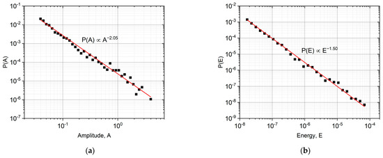 As can be seen from Figure 4, the exponents of the probability distribution functions of energy and amplitude are in good agreement with the results of [25,29].