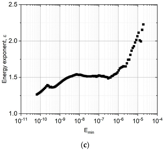 We can also compare the exponents of the amplitude or energy probability density functions with exponents given in [25,28,29] for type I twin boundary (α = 2.25 [25] and ε = 1.45 [25,28,29] in the as well as in the relations), and those obtained from the probability distributions determined in our measurements. Figure 4 shows these functions, and it can be seen that it gives α = 2.05 and ε = 1.50, i.e., the agreement is good. Figure 4c shows the so-called maximum likelihood, ML, estimation [30] of the energy exponent, and this gives ε = 1.51 ± 0.1, and a similar estimation for α resulted in α = 2.1 ± 0.1. The results of the ML fits are in good agreement with the values shown in Figure 4a,b.