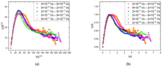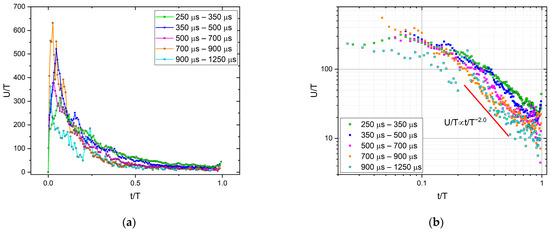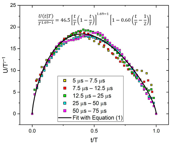 where is the time variable, is the exponent of the size-duration relation , is the asymmetry factor, and is the scaling function characterizing the average temporal avalanche shape. Thus, on the basis of (1), it is expected that the voltage signal divided by and the time scale divided by T will provide universal scaled functions with some skewness. In addition, it was demonstrated in [3] for Barkhausen noise from the well-known Alessandro–Beatrice–Bertotti–Montorsi (ABBM) model that not only a skewness of the inverted parabola, described by the parameter b [15], is possible but there can be a gradual flattening of the above-scaled function for increasing T (caused by finite values of the demagnetization factor). This flattening was also experimentally demonstrated for plastic deformation of metallic glasses [16], as well as for metal alloys by localized deformation bands (Portevin–Le Chatelier effect) [17]. On the other hand, it was also shown in [18], from acoustic emission (AE) measurements of microcrack formations during compression of different concrete samples, that there can be strong leftward asymmetry in the shape of the functions because the avalanche accelerated faster than it decelerated. Furthermore, it was found that the curves did not collapse on a common curve after rescaling. It was also shown in [18] that the slow decaying part of can be well fitted by the power function of , i.e., with p = 2.05.