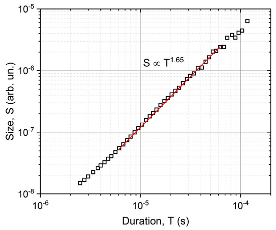 In Section 3.1 and Section 3.2, results obtained from the analysis of AE measurements are shown. In this subsection, we apply the same methodology to avalanches measured by the ME sensor. These avalanches were detected in the same experiments as the AE avalanches analyzed above, i.e., using the same experimental conditions and material [24].