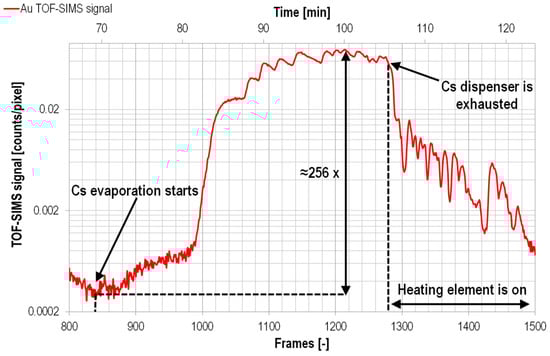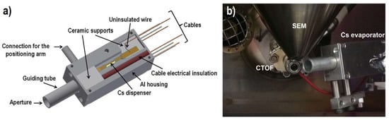 However, all of these approaches demanded either expensive dedicated instrumentation and/or operating under UHV conditions. Furthermore, these solutions cannot be easily adapted in the case of HV-compatible TOF-SIMS add-ons integrated within standard FIB/SEM systems, whose application scope is preliminary focused on sample preparation and electron-based sample characterization (e.g., EBDS or EDX). Therefore, to enable Cs atom delivery to a sample’s surface, a novel compact laboratory Cs evaporator prototype was designed and fabricated [23]. Its operation (Figure 3) is based on applying commercially available solid alkali metal dispensers (AMDs). Since AMDs are made of stable Cs salts [171], they are safe, which is a great advantage over highly reactive Cs metal. By applying an electric current to the dispenser, which induces Joule heating, neutral Cs is evaporated. The conducted TOF-SIMS experiments [23] showed that using the described setup can increase the Au- ion signal by at least a factor of 256 (Figure 4) compared to experiments conducted without any supplementary gases. Moreover, experimental condition optimization (i.e., the electric current, temperature, and use of multiple Cs dispensers) can ensure a stable Cs flux for a sufficiently long time (almost 1.5 h) to conduct TOF-SIMS depth profiling (requiring usually tens of minutes) of complex samples, such as heterogeneous structures and thin film-based multilayers. However, the main drawback of using Cs dispensers is the long waiting time needed to reach the thermal equilibrium (between 1.5 h and 4.5 h, depending on the experimental settings).