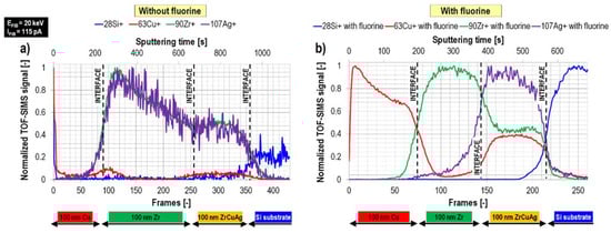 Fluorine gas-induced separation of mass interference during a FIB-TOF-SIMS measurements [5]. The TOF-SIMS depth profiles of the Cu/Zr/ZrCuAg@Si sample acquired without (a) and with fluorine gas (b). Reprinted with permission from A. Priebe et al., “Application of a Gas-Injection System during the FIB-TOF-SIMS Analysis—Influence of Water Vapor and Fluorine Gas on Secondary Ion Signals and Sputtering Rates”, Analytical Chemistry 2019 91 (18), 11712–11722 [21]. Copyright © 2019 American Chemical Society.