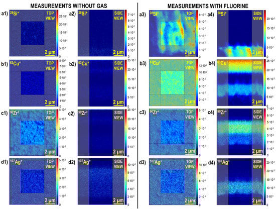 The 2D chemical images of the Cu/Zr/ZrCuAg@Si sample obtained without (a1–d1,a2–d2) and with (a3–d3, a4–d4) fluorine gas [5]. The top views (a1–d1,a3–d3) represent lateral images in the x-y plane, and the side views represent the depth images in the x-z plane. The shadowed regions show the data excluded when generating the depth profiles (given in Figure 5). Reprinted with permission from A. Priebe et al., “Application of a Gas-Injection System during the FIB-TOF-SIMS Analysis—Influence of Water Vapor and Fluorine Gas on Secondary Ion Signals and Sputtering Rates”, Analytical Chemistry 2019 91 (18), 11712–11722 [21]. Copyright © 2019 American Chemical Society.