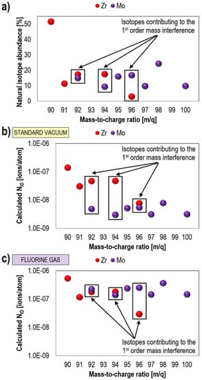 The outstanding phenomenon of gas-induced separation had never been reported before, neither for fluorine nor for any other gas. Therefore, dedicated comprehensive studies were conducted to understand its underlying mechanisms [6]. Zr, Mo, and Ag were chosen as the most representative candidates, as their combination within a specimen ensured an extreme case of multi-scenario mass interference. This included mass interference between single isotopes (i.e., isobaric interference, first-order mass interference) of Zr and Mo, whose three isotopes have almost the same m/q values (at m/q = 92, 94, and 96) and higher order mass interference, in which single isotopes, as well as complex molecules (usually hydrides, oxides, and hydroxides) take part. It was confirmed that fluorine significantly modifies the ionization process (i.e., matrix effect) during Ga+ primary ion beam bombardment, and the response of different elements to the presence of F is characteristic, resulting in signal variations by several orders of magnitude. Furthermore, it was observed that not only the values of GAETOF-SIMS but also a percentage contribution of the element’s isotopes (i.e., natural abundance, Figure 7) determine the success of fluorine gas-induced separation of mass interference. Finally, it was found that fluorine affects the efficiency of generating chemical bonds between metals and H−, O−, and OH−. This property, for example, can be correlated with fluorine electron affinity (322 kJ/mol), which is higher than the electron affinity of oxygen (141 kJ/mol) [172] and the aforementioned extreme electronegativity of fluorine.