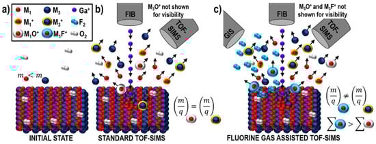 Diagram representing one of the potential mechanisms of fluorine gas-induced separation of mass interference: Change in complex-ion (such as oxides or hydrides) formation efficiency [6]. (a) A sample is made of two elements M1 and M2, whose masses are different (m1 < m2). (b) During Ga+ primary ion beam bombardment, complex ions are produced (oxygen comes from the oxidized sample surface or residual gas in an analytical chamber). (c) Fluorine affects the efficiency of metal–oxygen bond production, and metal fluorides are generated more favorably than oxides. Reprinted with permission from A. Priebe et al., “Mechanisms of Fluorine-Induced Separation of Mass Interference during TOF-SIMS Analysis”, Analytical Chemistry 2021 93 (29), 10261–10271 [6]. Copyright © 2021 American Chemical Society.