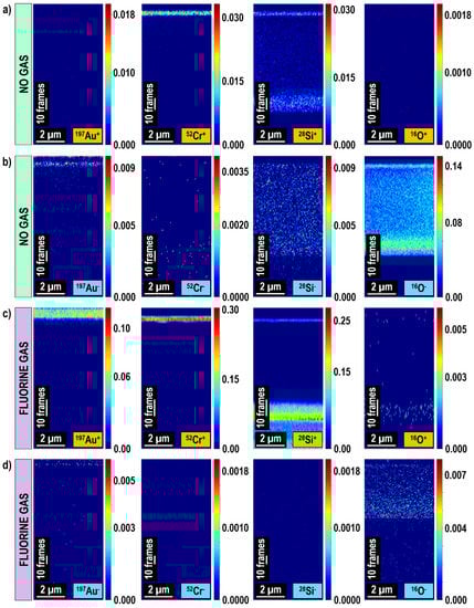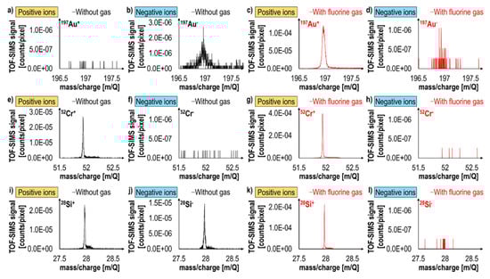 Figure 10 shows mass spectra of a Au/Cr/SiO2/Si sample, which were acquired during experiments conducted in the positive and negative ion detection modes as well as under standard vacuum conditions and in the presence of fluorine gas [22]. The discussed sample represents an excellent research model system as it contains elements, which under standard vacuum conditions dominantly ionize with a negative charge (Au), with a positive charge (Cr), and with both positive and negative charges (Si, a semiconductor). Extraordinarily, the addition of fluorine gas during Ga+ sputtering resulted not only in significant positive secondary ion signal enhancement (by an order of magnitude in the case of Cr and Si) but also in the inversion of charge polarity from negative to positive (as in the case of Au and Si). Interestingly, the Au+ signal measured in the presence of fluorine was two orders of magnitude higher than the dominant Au- signal measured under standard vacuum conditions. Furthermore, the measured negative ion signals were decreased, i.e., roughly by a factor of three in the case of Au and to the background (noise) level in the case of Si. This study [22] proves that FIB-TOF-SIMS conducted at intermittent primary ion beam energies (20 keV) and supported with the simultaneous delivery of fluorine gas to a sample’s surface can provide enhanced resolution, direct and complete information on a sample’s 3D chemical structure, based on positive secondary ions detection (Figure 11).