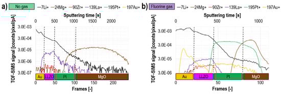 Au was chosen as the most representative element as it is one of few metals, which dominantly generates negative ions during bombardment via a primary ion beam. Furthermore, due to its outstanding chemical stability, Au plays an important role in the development of rechargeable thin-film solid-state Li batteries [173,174,175,176]. Even at high temperatures, Au enables operating with extremely reactive redox species (such as Li), and thus, it can be used as a current collector. However, as a noble metal, Au is very mobile and has a tendency to diffuse during device operation [177]. This implies the necessity of representing Au distributions precisely, together with the distributions of other system components, which usually ionize with a positive charge. This is particularly important when studying processes occurring at the interfaces of multilayers (such as alloy formation or element diffusion) and to detect potential degradation factors limiting the functionality of a device.
