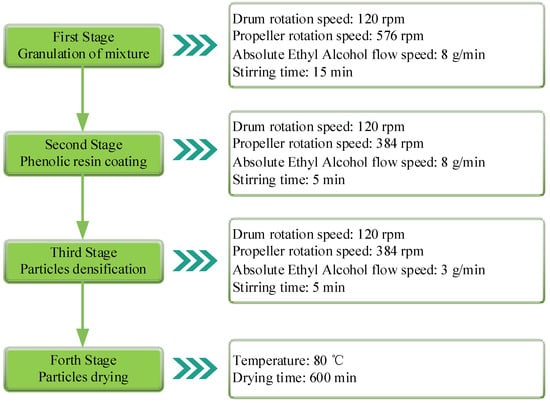 The second step was wet granulation, which can separate PEEK fibers and phenolic resin physically to avoid crosslinking solidification. Figure 2 shows the granulation process in this study. The total quantity of Absolute Ethyl Alcohol was about 40 ωt% of the mixture. The granulation device was a Laboratory Tumbling Granulator (JF805R, Wangda, Changchun, China), and the drying device was a Heat-Treated Case (JF980S, Wangda, Changchun, China).