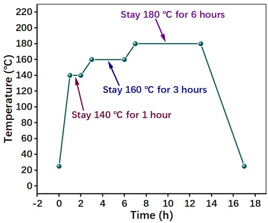 The third step was hot-pressing. Granules were molded for 10 min at 160 °C under 45 MPa by a hot compression machine (JFY50, Wangda, Changchun, China), according to our previous study [13,20,21]. To release volatiles, three intermittent ‘breathings’ were carried out during hot-pressing. To remove the remaining stress after hot-pressing, the samples were heat-treated by a Heat-Treated Case (JF980S, Wangda, Changchun, China), and the temperature is shown in Figure 3.