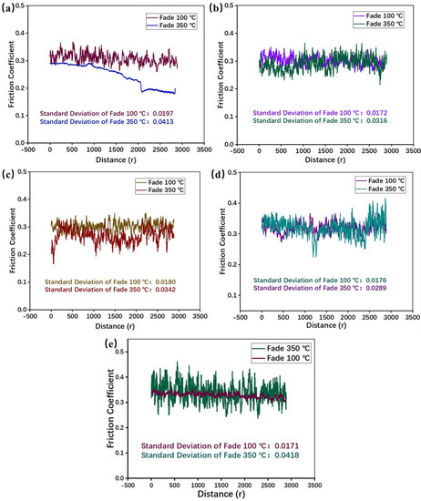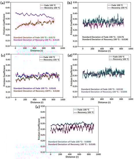 The tribological test was divided into two stages: a fade test and recovery test. The fade ratio (FFade) and recovery ratio (FRecovery) are calculated according to Equation (3) and Equation (4), respectively.