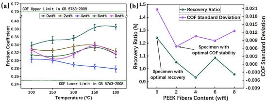 Figure 8 presented the result of the recovery test. It can be inferred from Figure 8a that PEEK fibers could also effectively influence the COF in the recovery test. As the temperature decreases, the trend of the COF varies with different numbers of of PEEK fibers. Specifically, RBFM-1 showed a gradually increasing trend of the COF. The lower COF at high temperatures is caused by the reduction in strength resulting from the softening and thermal decomposition of the phenolic matrix [36,37]. With the addition of PEEK fibers, molten PEEK fibers on the friction interface help to adhere wear debris and promote the formation of continuous secondary plateaus under normal pressure; the high modulus of PEEK fibers can also reduce the heat fade. Therefore, the COF of specimens with PEEK fibers changes relatively smoothly as the temperature decreases [20,38,39].
