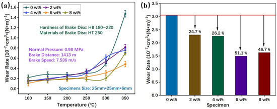 The result of the wear rate is shown in Figure 10. As is evident, the disc temperature can significantly affect the wear rate of the samples (Figure 10a). The high wear rate was related to the phenolic matrix softening and the thermal decomposition at high temperatures [36,43]. This is consistent with our previous research [26,34]. From Figure 10a, it can be seen that the wear rate increases with increasing temperatures. Between 100 and 250 °C, the wear rate increases slowly; however, it increases more rapidly from 250 °C to 350 °C. The phenolic matrix mainly undergoes matrix softening at low temperatures so that the specimens can still maintain a high strength [13]. However, the phenolic matrix would decompose at high temperatures, which would cause a rapid decrease in strength; thus, the wear rate increases rapidly [36].