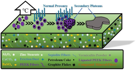 Figure 12 presents the formation mechanism of the secondary plateaus of PEEK fibers-reinforced friction materials. During friction, a series of physical and chemical changes occur on the worn surface, and parts of materials are detached from the worn surface and form wear debris. Wear debris has a certain obstructive effect on the relative slide between the counterpart and the specimen, and it may also damage the specimen or counterpart [54,55]. During friction, due to the excitation of high temperature, PEEK fibers melt and then encapsulate wear debris on the friction interface, which can prevent hard particles from damaging the friction surface and can also adhere wear debris, promoting the formation of secondary plateaus, forming the protection for friction materials and reducing abrasion [56,57].