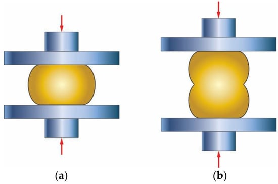 The deformation behavior of the material varies with the geometry of the slap once subjected to compression. Useful information about deformation and failure modes can be extracted from compression tests, as shown in Figure 2. Friction is a source of inconsistent deformation in compression of ductile materials and represents a resistance to lateral flow at the mating surfaces, which leads to barreling or bulging of the cylindrical surface. It is reported [,] that if the cylindrical specimens have length-to-diameter ratios (L/D) less than 2.0, a single barrel forms, as shown in Figure 2a. Barreling indicates that the deformation is not uniform, and thus the stress and strain vary throughout the test specimen. At the same friction circumstances with an L/D of order 2.0, a double barrel forms, Figure 2b.